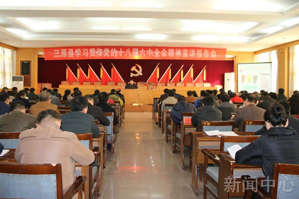 12月6日,我縣在縣委三樓會議室舉辦十八屆六中全會精神宣講報告會。全體縣級領導,各鎮(辦、中心)黨委(工委)書記、鎮長(主任),縣級各部門黨政負責人,各條管部門主要負責人等聆聽了